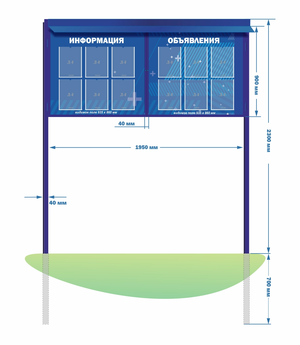 Конструкция стенда герметична (с уплотнительной лентой), дверцы распашные на петлях. Соединения сварные, что делает конструкцию антивандальной, устойчивой к ветровым нагрузкам. Возможно изготовление с пробкой или магнитной поверхностью, наполнение объемными карманами, ящиком для писем, а так же выполнение с подсветкой. Дизайн стенда изменяется по требованию заказчика.