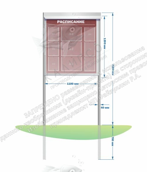 Каркас стенда выполнен из стальной профильной трубы 20*40*2мм, двери из стальной профильной трубы 20*20*1,5 мм, ножки из стальной профильной трубы 40*60*3 мм. Покраска в основные цвета грунтовка + эмаль. Панель стенда изготовлена из прочного листового алюминиевого композита толщиной 3 мм, полноцветная печать на пленке с защитной ламинацией, карманы из ПЭТ-0,5 мм, крепление на двухстороннем скотче. Стекло дверей: безопасное прочное орстекло - 4 мм. Козырек металл - 0,45 мм.
