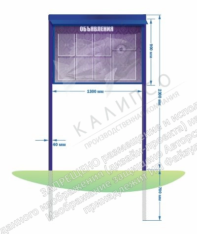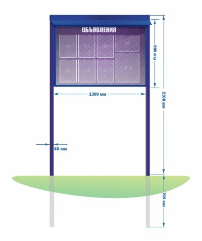 Конструкция стенда герметична (с уплотнительной лентой), дверцы распашные на петлях. Соединения сварные, что делает конструкцию антивандальной, устойчивой к ветровым нагрузкам. Возможно изготовление с пробкой или магнитной поверхностью, наполнение объемными карманами, ящиком для писем, а так же выполнение с подсветкой. Дизайн стенда изменяется по требованию заказчика.
